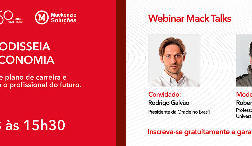 No dia 26 de agosto, a partir das 15h30, será realizada a oitava edição do Mack Talks, série de encontros virtuais para debater cenários e tendências do mundo corporativo. Neste novo webinar, o tema discutido será 2021: Uma odisseia na nova economia, um debate sobre plano de carreira e oportunidade para o profissional do futuro. A participação no encontro é gratuita, mediante inscrição.
