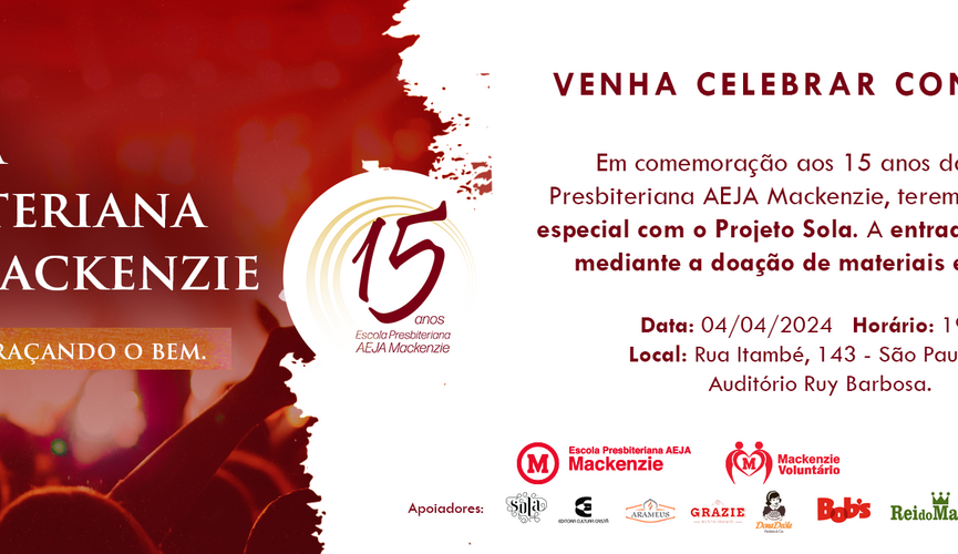 No dia 04 de abril, a Escola Presbiteriana AEJA Mackenzie realizará um evento beneficente em comemoração aos seus 15 anos, completados neste ano de 2024, no auditório Ruy Barbosa, Campus Higienópolis. A celebração contará com o show do Projeto Sola, além da participação do Coral AEJA Mackenzie.