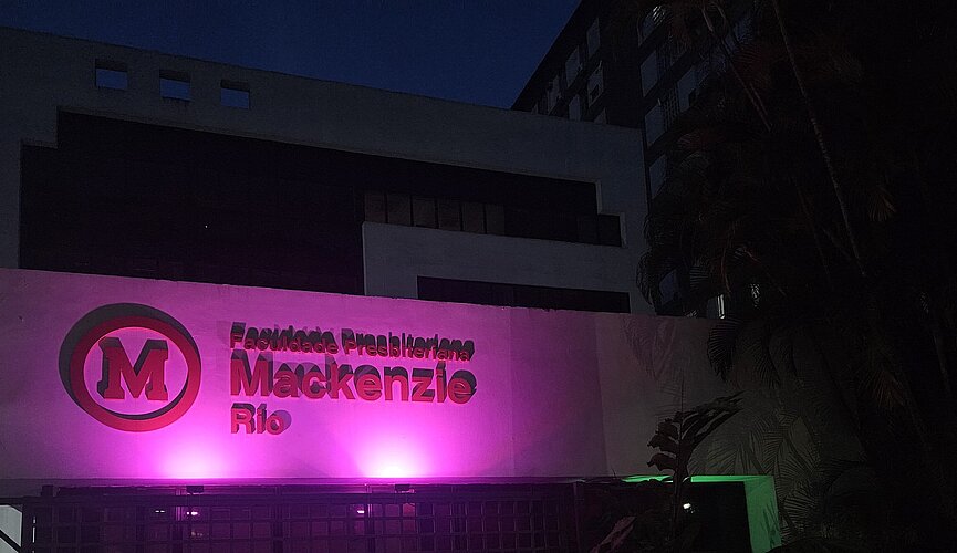 Durante todo o mês de outubro, a fachada da faculdade ganha uma iluminação especial na cor rosa, como forma simbólica de apoiar a causa e chamar a atenção da comunidade local para a importância da prevenção.