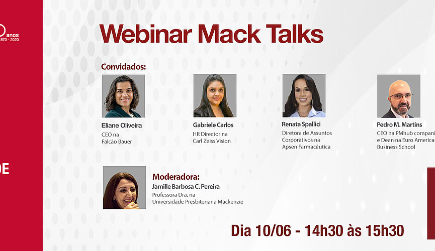 O encontro online, promovido pelo Mackenzie Soluções, do Instituto Presbiteriano Mackenzie (IPM), terá duração de aproximadamente uma hora e contará com a participação da CEO da Falcão Bauer, Eliane Oliveira; da HR Director na Carl Zeiss Vision, Gabriele Carlos; do CEO da PMhub Companies e Deão na Euro American Business School, Pedro Martins; e da Diretora de Assuntos Corporativos da Apsen Farmacêutica, Renata Spallici. O webinar será moderado pela professora da Universidade Presbiteriana Mackenzie, Jamille Barbosa Cavalcanti Pereira.