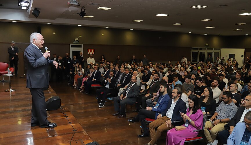Para Temer, a constituição conseguiu ser longeva porque uniu questões dos direitos sociais com princípios liberais, e alertou os jovens da Universidade que assistiam ao evento.