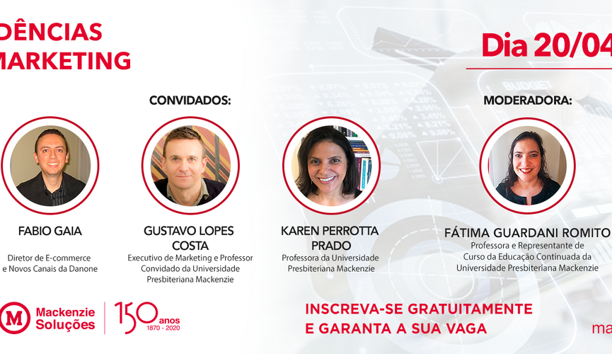 O Centro de Ciências Sociais e Aplicadas (CCSA) da Universidade Presbiteriana Mackenzie (UPM), com o apoio do Mackenzie Soluções, área de negócios do Instituto Presbiteriano Mackenzie(IPM), realizará o webinar que terá como tema Novas Tendências em Trade Marketing. O encontro será na terça-feira, 20 de abril, às 20h. Para participar, é necessário fazer inscrição prévia.
