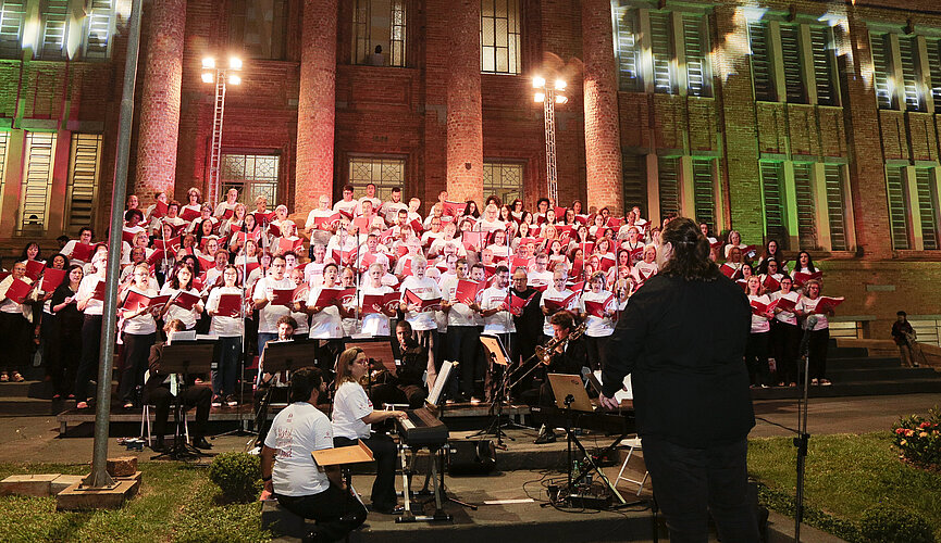 Grupos de amigos, famílias com crianças no colo ou de mãos dadas com seus pais olhavam atentos para os coralistas que tomavam seus lugares, preenchendo os degraus do lindo seminário de tijolos vermelhos, decorado com luzes coloridas. O silêncio se quebrou quando o coro com mais de 300 vozes, entre jovens, adultos e crianças, se elevou para celebrar a data mais bela do ano: o Natal.