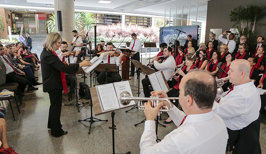 O vão do MackGraphe, no campus Higienópolis do Mackenzie, ficou completamente cheio de colaboradores e alunos que acompanharam, nesta quinta-feira, 12 de dezembro, a apresentação da cantata de Natal do Coral da Capelania universitária, da Chancelaria do Mackenzie.