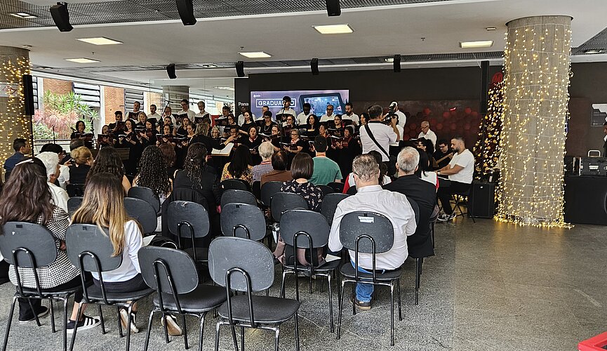 Na tarde desta quinta-feira, 05 de dezembro, os corredores da Universidade Presbiteriana Mackenzie (UPM), campus Higienópolis, foram embalados por belíssimas canções natalinas com a apresentação da cantata Um Natal Inesquecível, pelo Coro Mackenzie de Música Sacra.