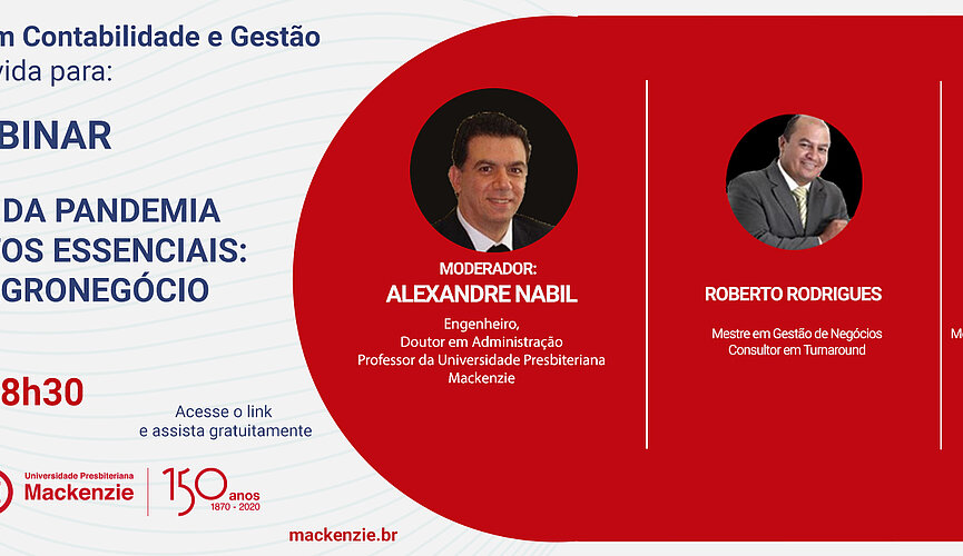 No dia 08 de outubro, acontece o webinar “O impacto da pandemia em segmentos essenciais - Saúde e Agronegócio”, realizado pelo Mackenzie Soluções, área de negócios do Instituto Presbiteriano Mackenzie (IPM), e a Universidade Presbiteriana Mackenzie (UPM). O evento será transmitido pela plataforma Teams, a partir das 18h30.